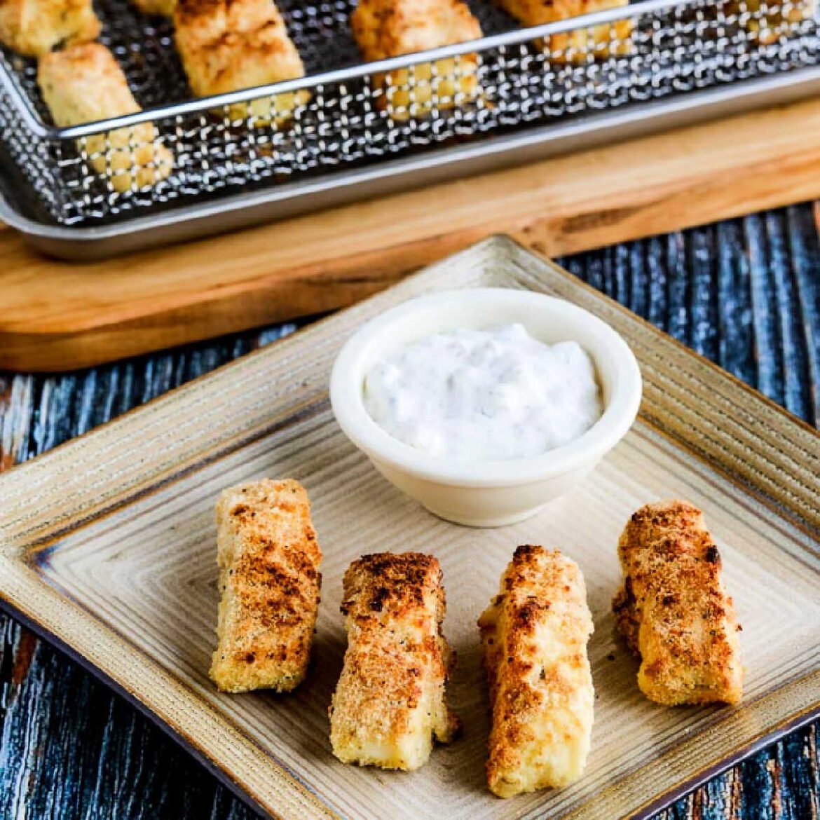 We used frozen cod that we thawed overnight, drained, and then sliced crosswise to make short pieces of fish. We dipped the fish in egg and then in almond meal that was seasoned with fish rub and a little black pepper. The fish sticks only take 10-12 minutes to cook in the Air Fryer, and then we devoured them with my favorite Double Dill Homemade Tartar Sauce.