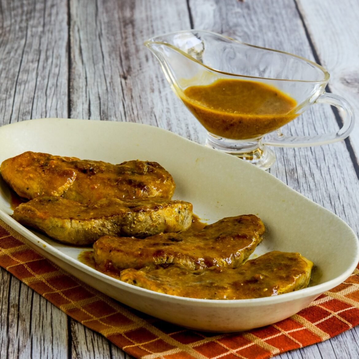 When we decided to update the photos for this recipe, Kara and I both felt the original method that browned the pork chops and then roasted them in a preheated 350F/176C oven for 8-10 minutes while you make the sauce was more steps than the recipe needed. For the updated method, we browned the pork chops, removed them to a plate while we made the sauce in the pan, and put pork chops back into the sauce to finish cooking. We also increased the recipe to use 4 pork chops, but only slightly increased the amount of sauce (and used lower-carb apricot preserves) which made this recipe even lower in carbs. (If you were a fan of the original method of browning and then roasting the pork chops, you can definitely still make them that way.)