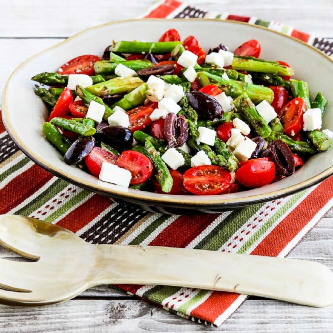 This recipe features lightly cooked asparagus, making it a great choice for those who prefer their asparagus less crunchy. The addition of tomatoes, olives, Feta Cheese, and lemon gives this asparagus salad a Greek twist, with Greek Seasoning used in the dressing to enhance those flavors.
