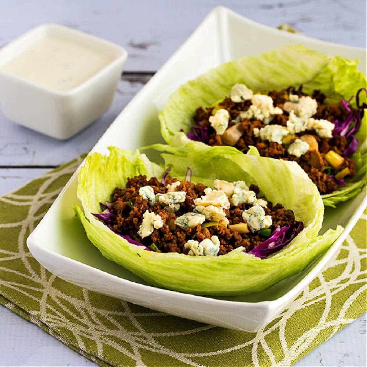 Square image of Buffalo Chicken or Turkey Lettuce Wraps in serving dish on green-white-napkin.Square image of Buffalo Chicken or Turkey Lettuce Wraps in serving dish on green-white-napkin.