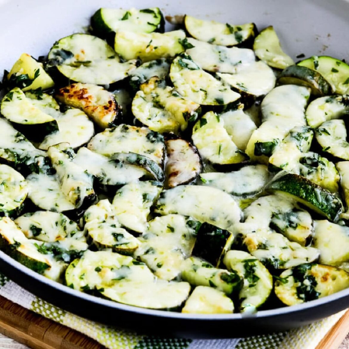 Cheesy Zucchini with Garlic and Parsley shown in pan on cutting boardCheesy Zucchini with Garlic and Parsley shown in pan on cutting board