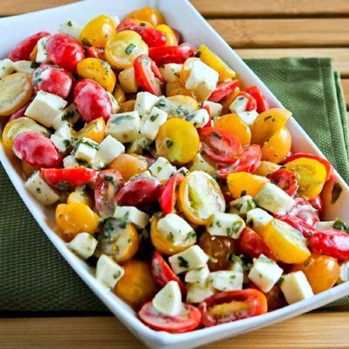 This amazing version of Caprese Salad with cherry tomatoes, fresh mozzarella balls, and a generous amount of basil vinaigrette only has 6 net carbs per serving!