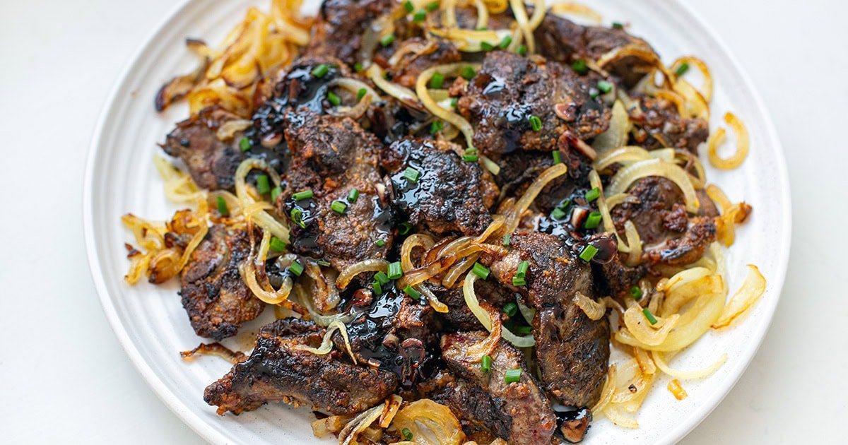 Pan-fried chicken livers and onions with a sweet and tangy balsamic wine glaze. A simple, nutritious, and surprisingly delicious dinner worth trying.