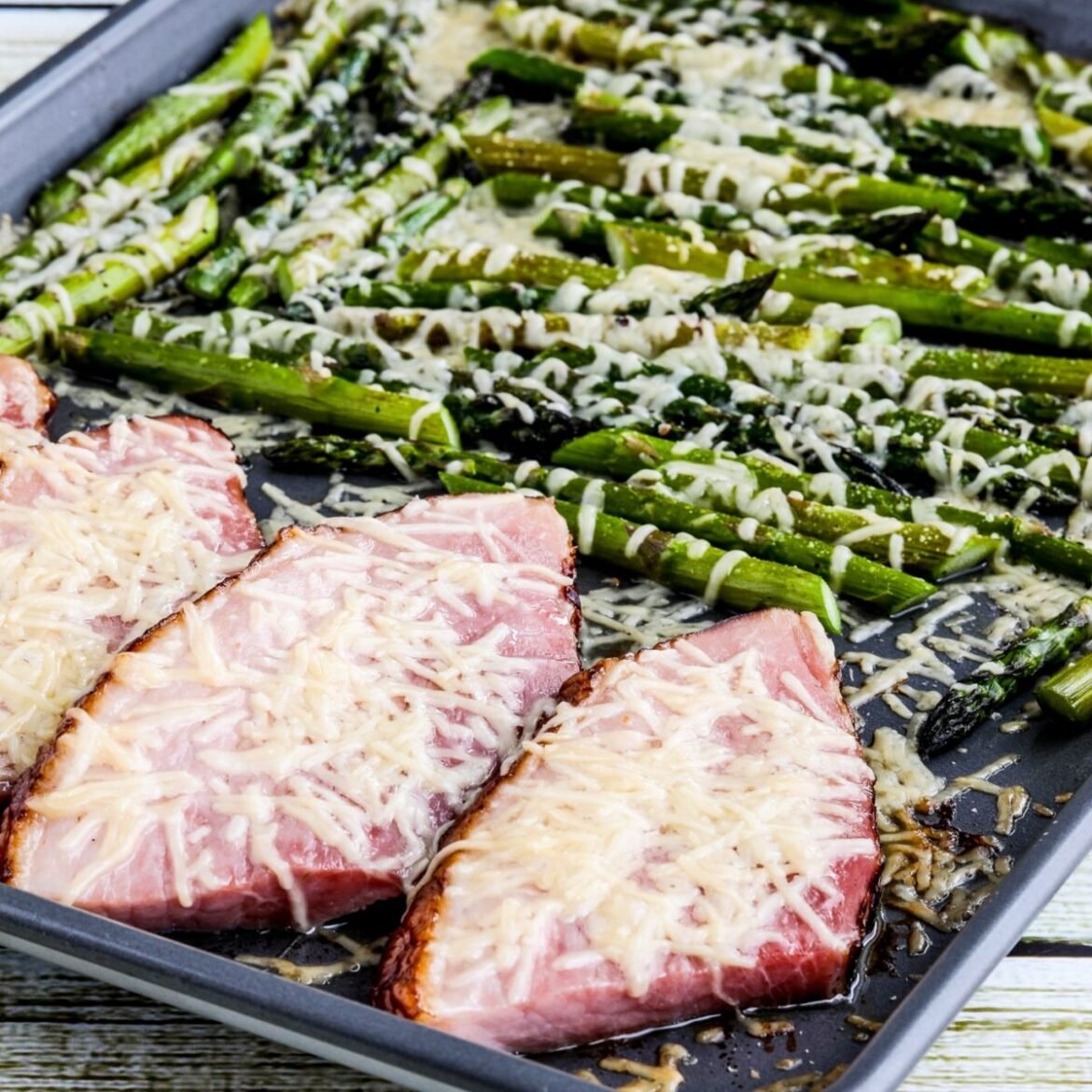 For this recipe, I used fairly thick slices of ham to allow the ham to bake while the asparagus roasts on the sheet pan. However, when testing this recipe, the ham turned out juicy and delicious, so you could use slightly thinner ham slices if necessary. In the case of very thinly sliced ham, I recommend wrapping the ham in foil for the initial cooking time, then unwrapping it when adding the Parmesan cheese.