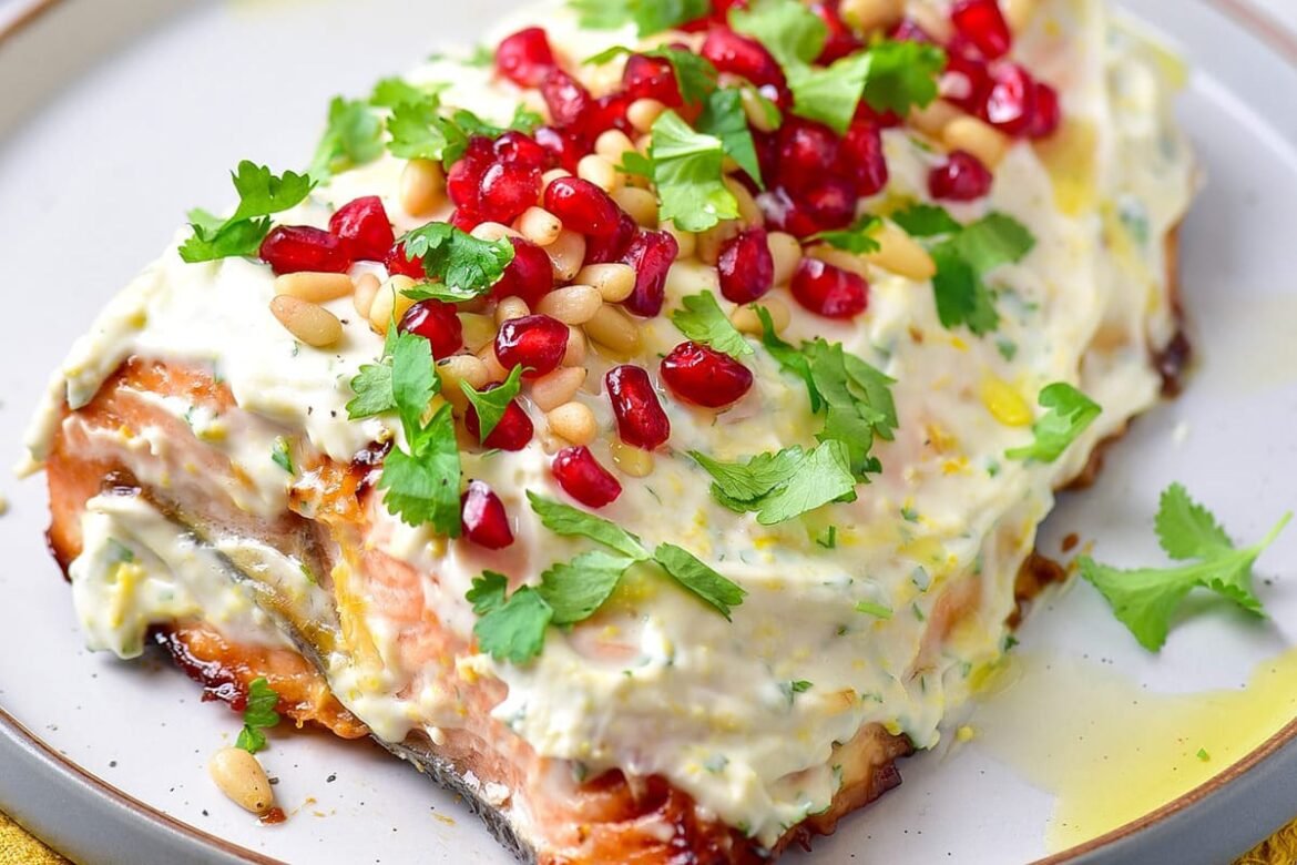 - Once the salmon has cooled slightly, transfer it to a serving plate and spread the sour cream mixture over it. Sprinkle with pomegranate seeds, pine nuts, and additional herbs on top.