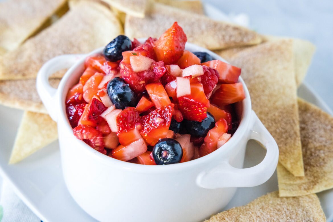 This simple fruit salsa is a delightful summer salsa recipe filled with fresh berries. You can personalize this appetizer with your favorite fruits and enjoy it with cinnamon chips at your next gathering.