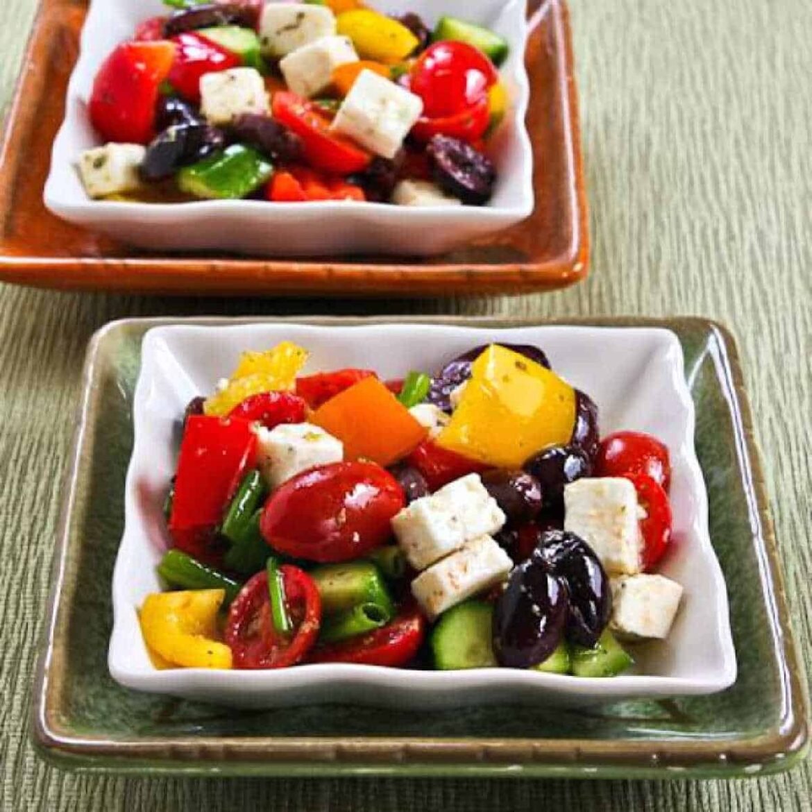 Pair this nutrient-rich Greek Salad with Peppers with main dishes like Almond and Parmesan Baked Fish, Marinated Flank Steak, Grilled Shrimp Skewers, Baked Parmesan Crusted Chicken, or Greek Lemon Chicken for a satisfying low-carb meal.