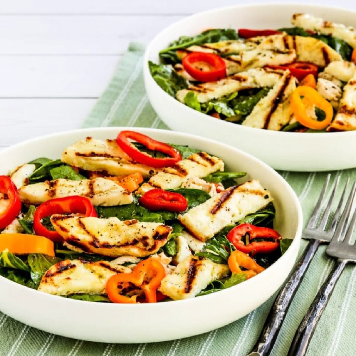 Grilled Halloumi Salad is a delightful low-carb main dish featuring chicken and mini peppers. If you prefer, you can omit these ingredients and create four side salads instead. Regardless of how you choose to serve it, the star of this salad is the grilled Halloumi and the zesty lemony dressing that truly make it stand out!