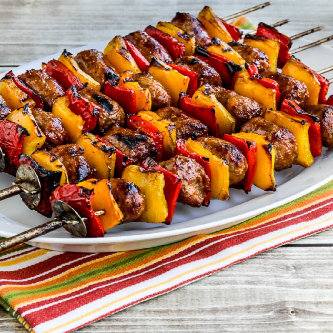 Grilled Sausage and Peppers kabobs shown on serving plateGrilled Sausage and Peppers kabobs shown on serving plate