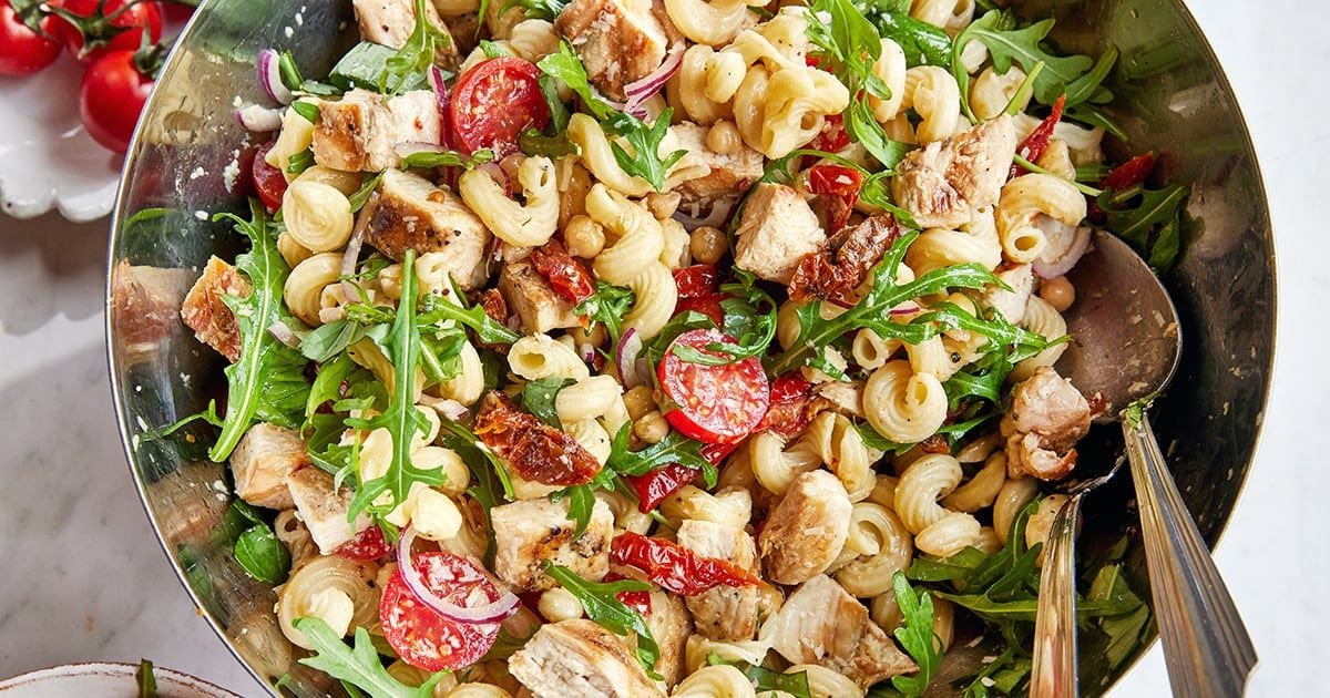 This high-protein pasta salad is fresh, filling, and packed with chicken, chickpeas, arugula and sun-dried tomatoes — perfect for easy lunches or meal prep.