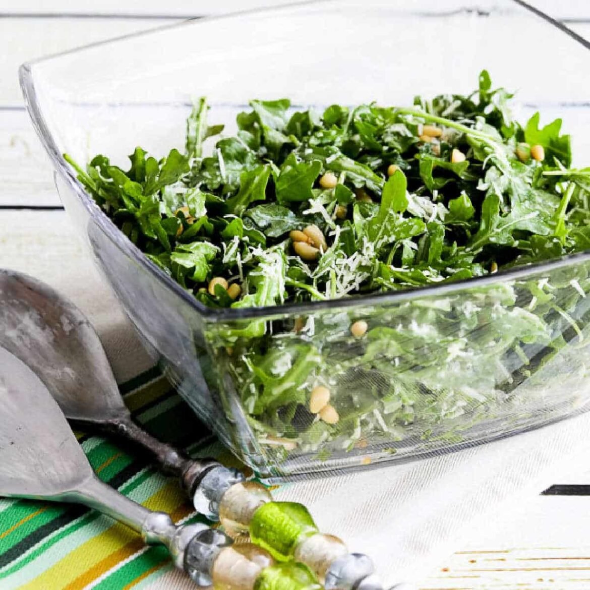 This Baby Arugula Salad has lemon, white balsamic vinegar, parmesan, and pine nuts, and it’s been one of my favorite salads for a long time! And personally I love arugula, and I think salads that include pine nuts are always a treat!