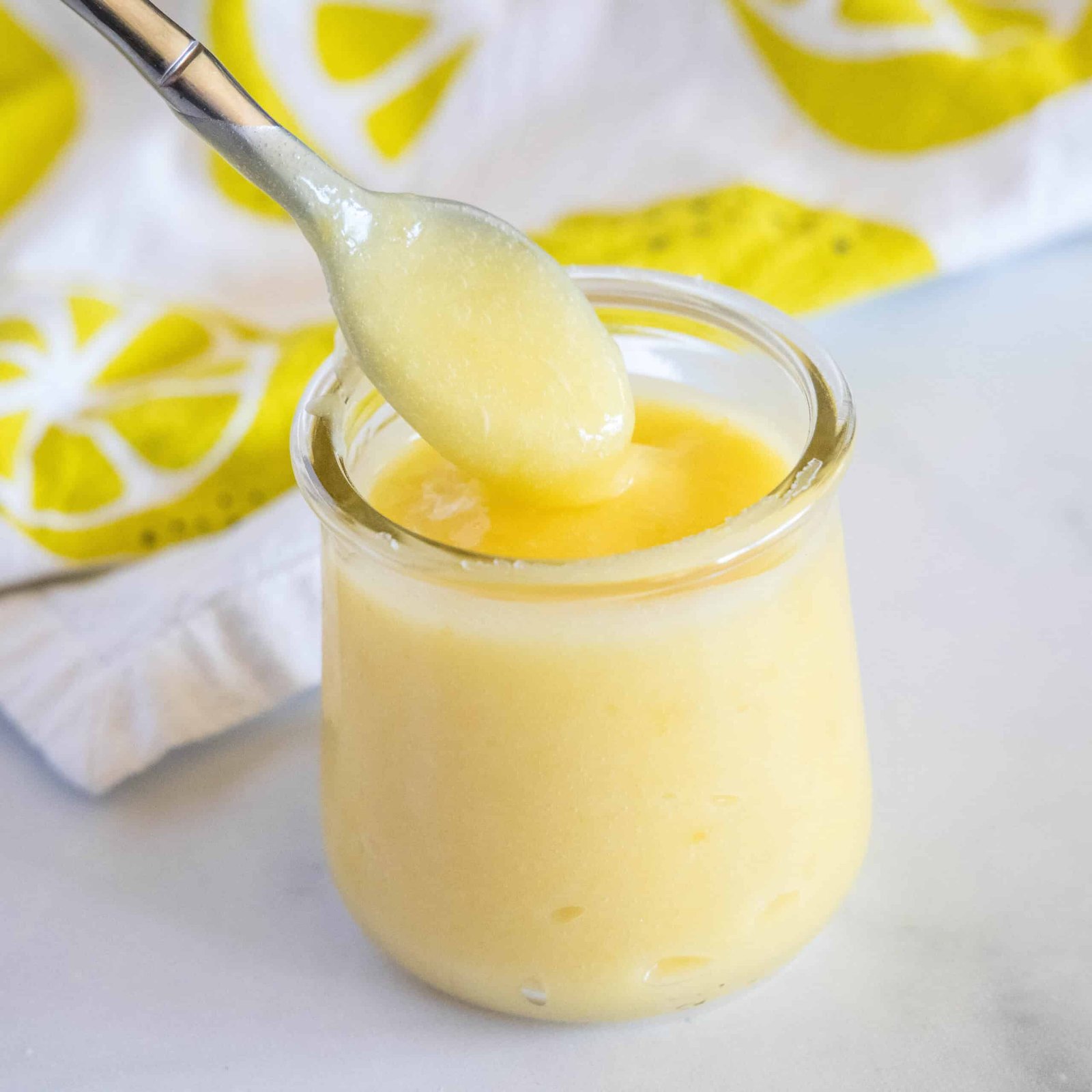 lemon curd being spooned out of a jar