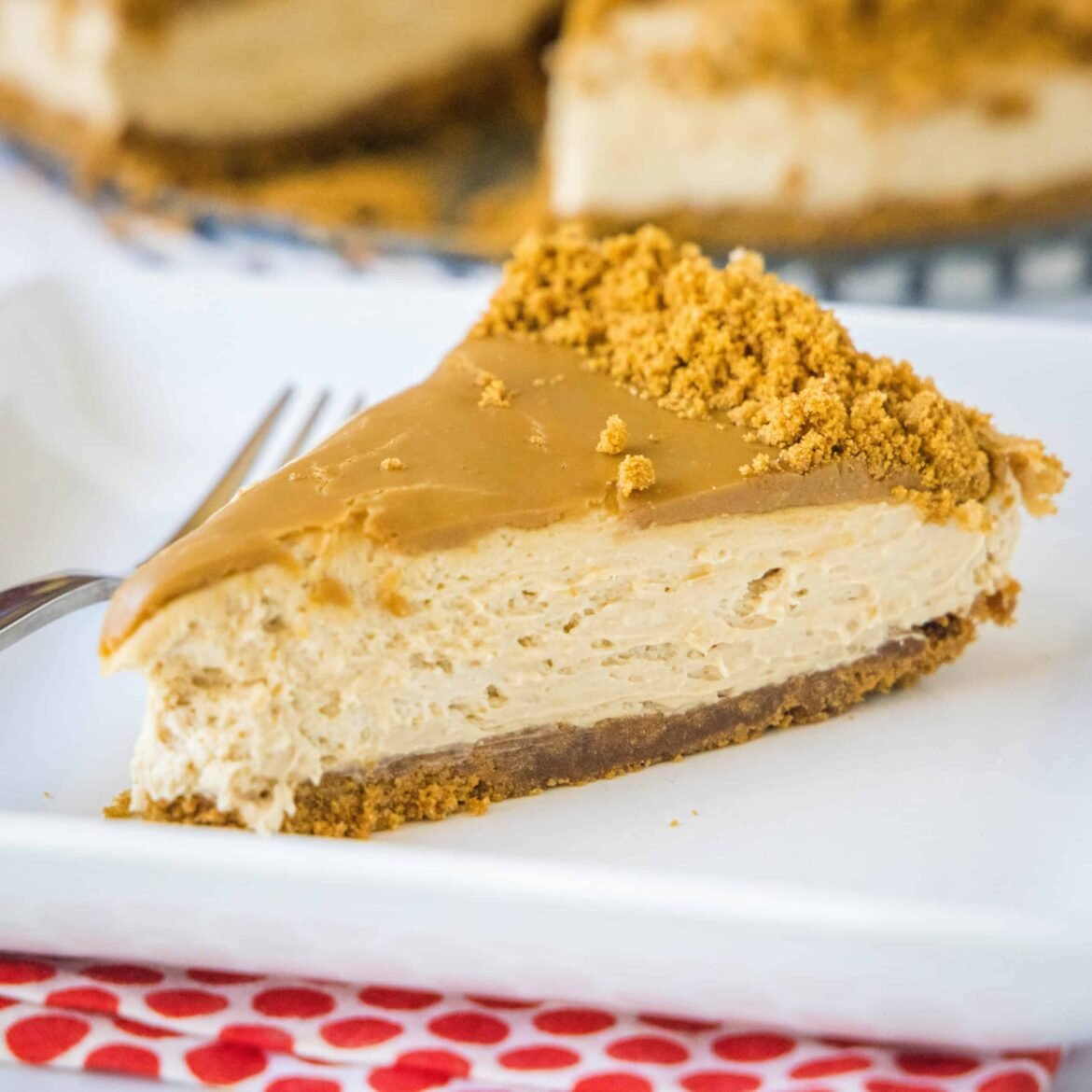 The crust is made from crushed Biscoff cookies. And the smooth, luscious cheesecake filling has Biscoff spread mixed in, as well as Biscoff spread drizzled over the top. It’s easy to make ahead and perfect for just about any day of the week.