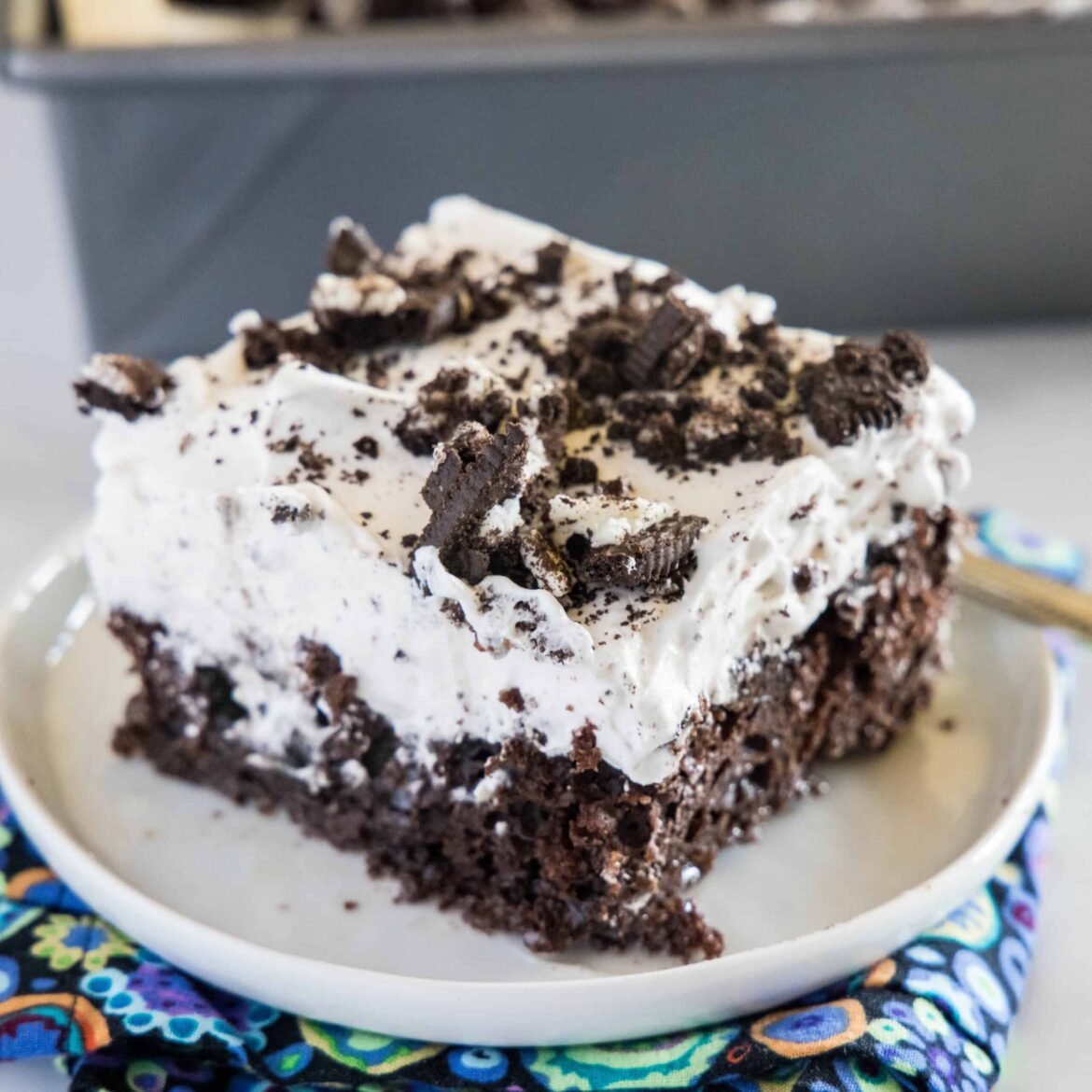 The Oreo pudding layer stays light and fluffy, the cake underneath turns impossibly soft, and the extra Oreos on top add just enough crunch to keep things interesting. It’s one of those desserts people keep “just cutting a sliver” of until the pan looks suspiciously empty.