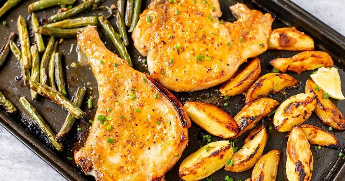 Tender oven-baked pork chops with lemony honey mustard glaze… plus roasted potatoes and green beans on the same tray? Yep, it’s my go-to easy yet nutritious weeknight sheet pan dinner.