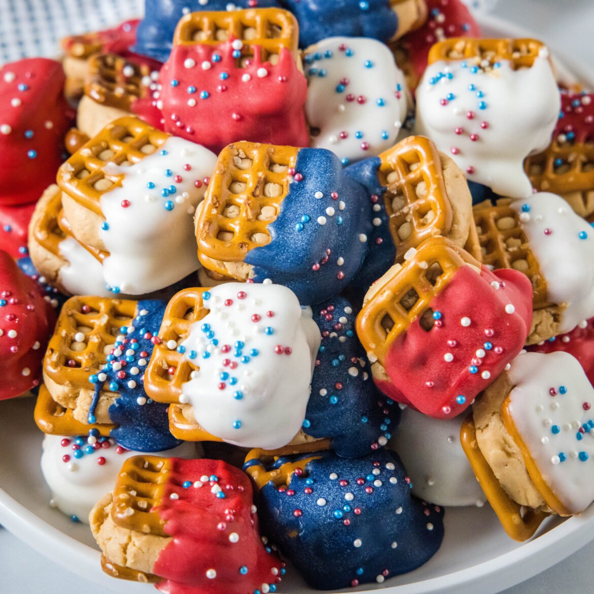 These Red White and Blue Peanut Butter Pretzel Bites are stuffed with peanut butter and coated in colored chocolate for a fun, easy, and festive treat!
