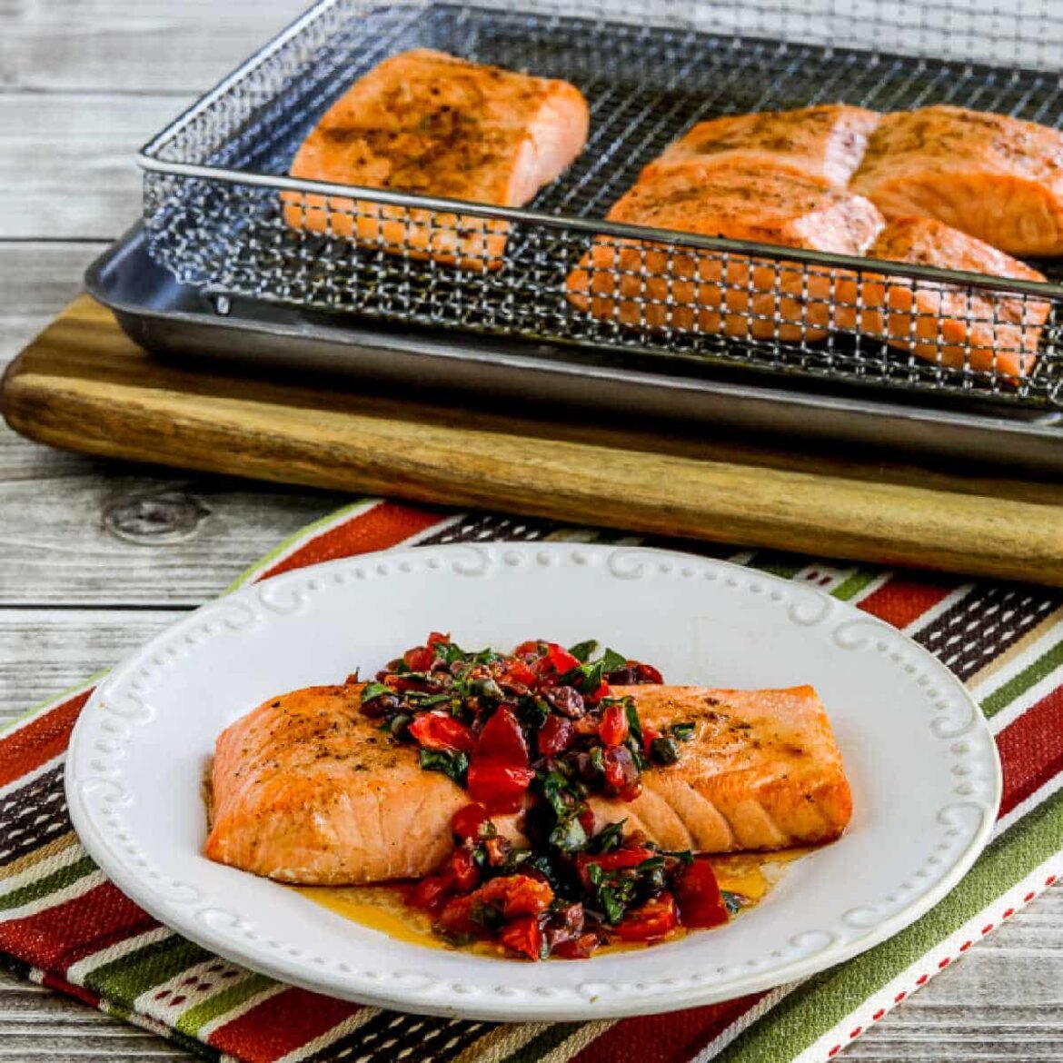 And although I’m a fan of Grilled Salmon, these days I often make easier Air Fryer Salmon instead. So when it came time to update the photos for this recipe it evolved into the delicious Air Fryer Salmon Recipe you see here, served with a delicious relish that had fresh tomatoes, Kalamata olives (or black olives), green onion, capers, and parsley.