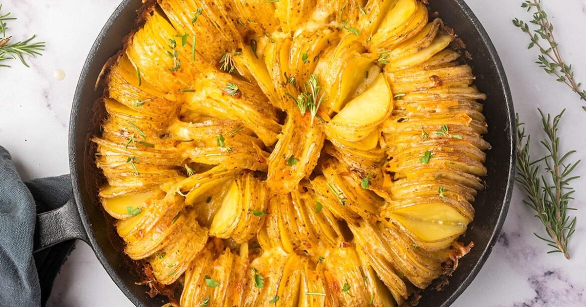 This sliced potato bake is my take on scalloped potatoes or potatoes au gratin but not as rich or heavy. The potatoes are thinly sliced and arranged in an accordion snail fashion in a round skillet, giving this dish such a gorgeous appearance. They look a bit like hassleback potatoes. Yes, it’s a bit of a process to get those thin potato slices tightly packed into the baking dish but the result is worth it!