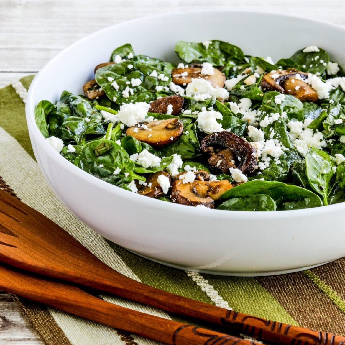 Spinach Salad with Mushrooms and Feta is a recipe that was inspired by another favorite spinach salad with bacon. This version substitutes bacon with nicely-browned mushrooms for a delicious twist.