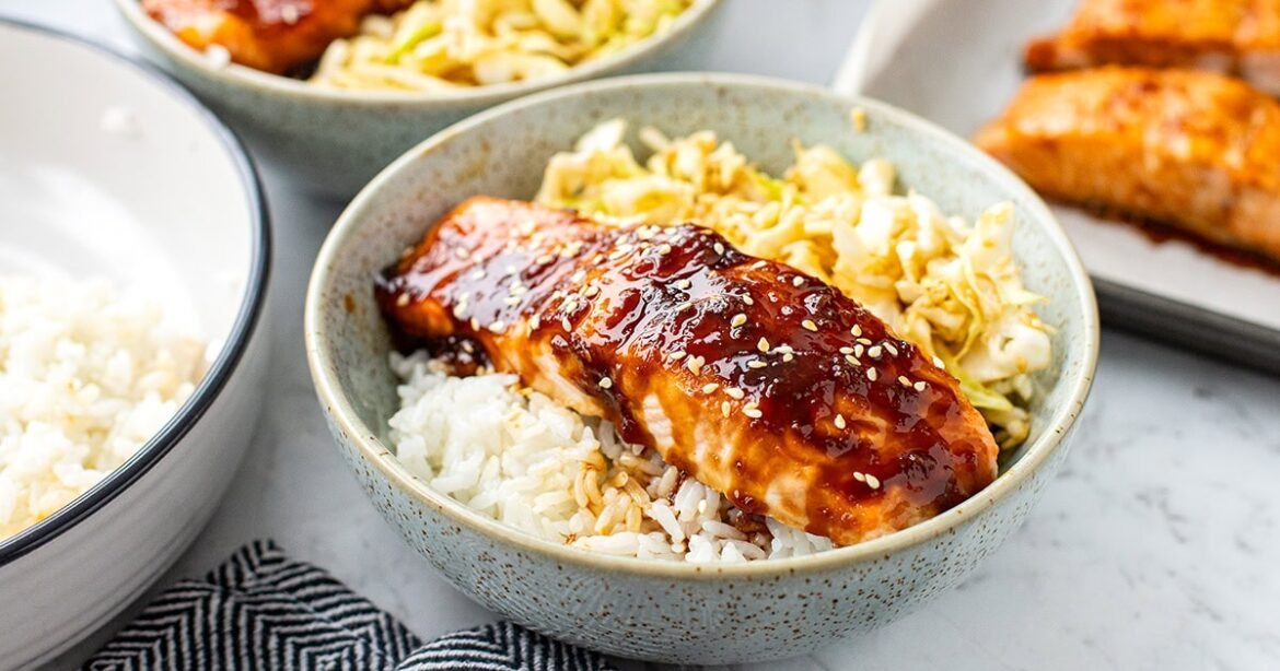 Each serving is packed with protein, carbs, and veggies, making it a well-rounded meal. You can also substitute cauliflower rice for a lower-carb alternative. This salmon recipe is a crowd-pleaser and is much better than takeout!
