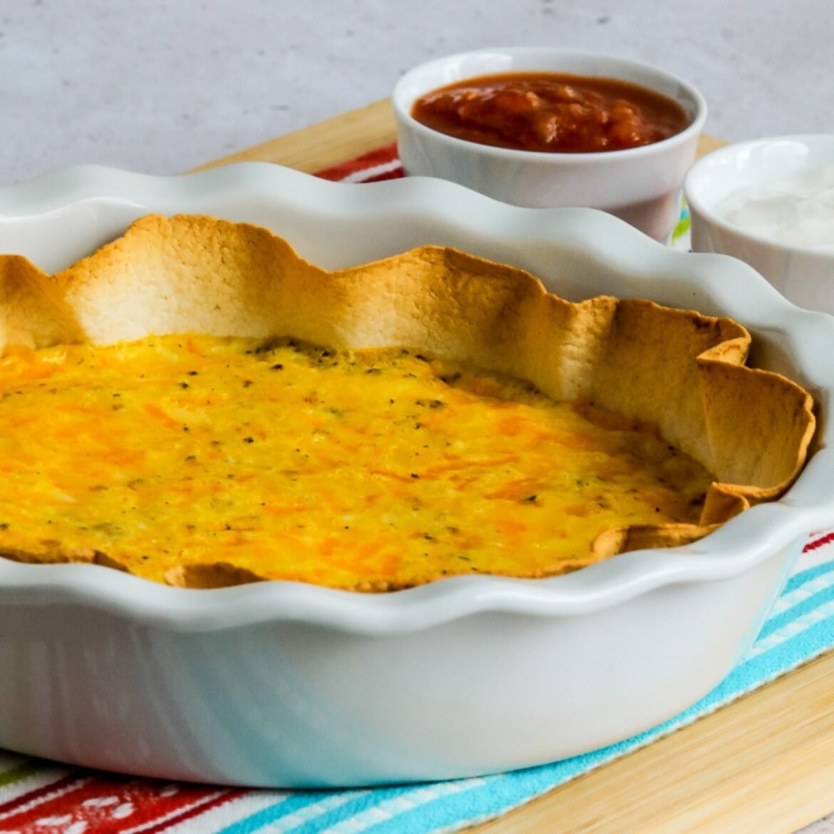 Tortilla Egg Bake with Cheese shown in pie dish with salsa and sour cream on the side.
